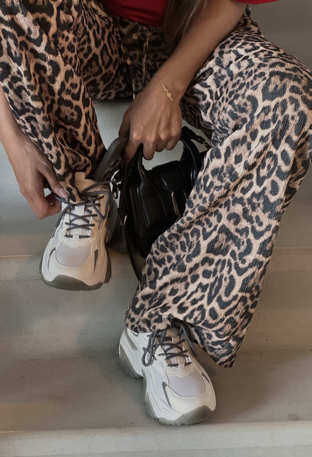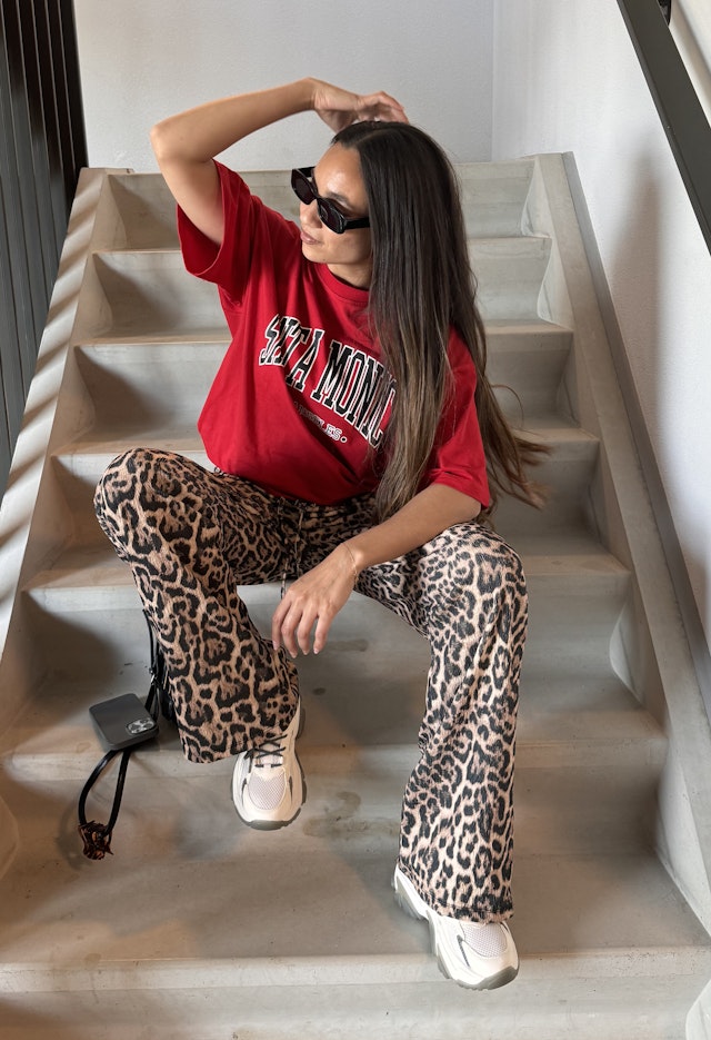 La tendance Printemps/Été 2024 : rouge et léopard. Adoptez cette tendance en combinant les baskets blanches populaires avec un jean léopard et un t-shirt oversize rouge. Stylisez le look avec des lunettes de soleil noires.