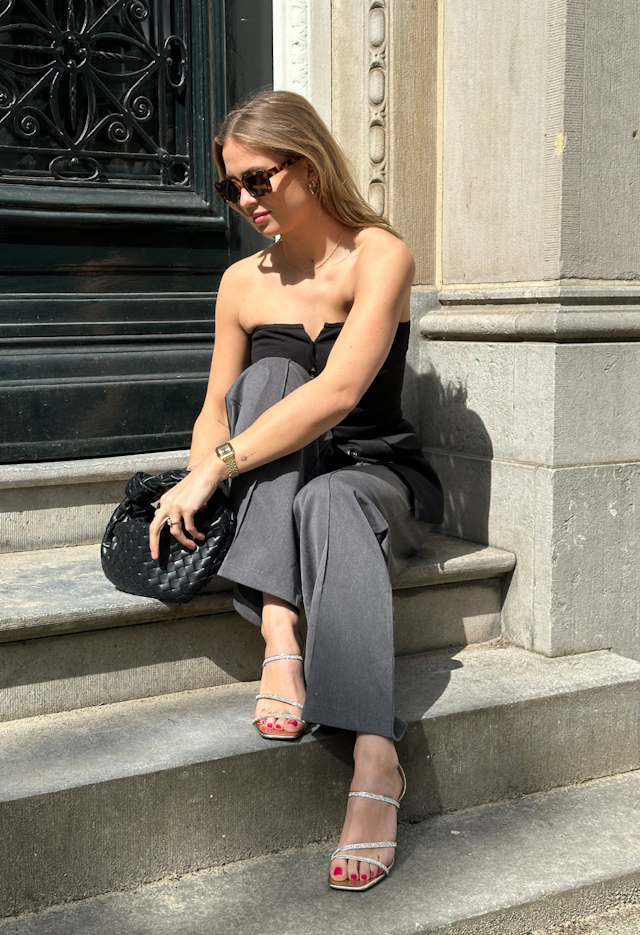 Une tenue estivale sophistiquée par @femkevermaas. Combinez les sandales à strass branchées avec un pantalon ample, un top ajusté épaules dénudées et un sac à main noir pour la parfaite touche finale. La tenue idéale pour un look estival chic et sophistiqué!