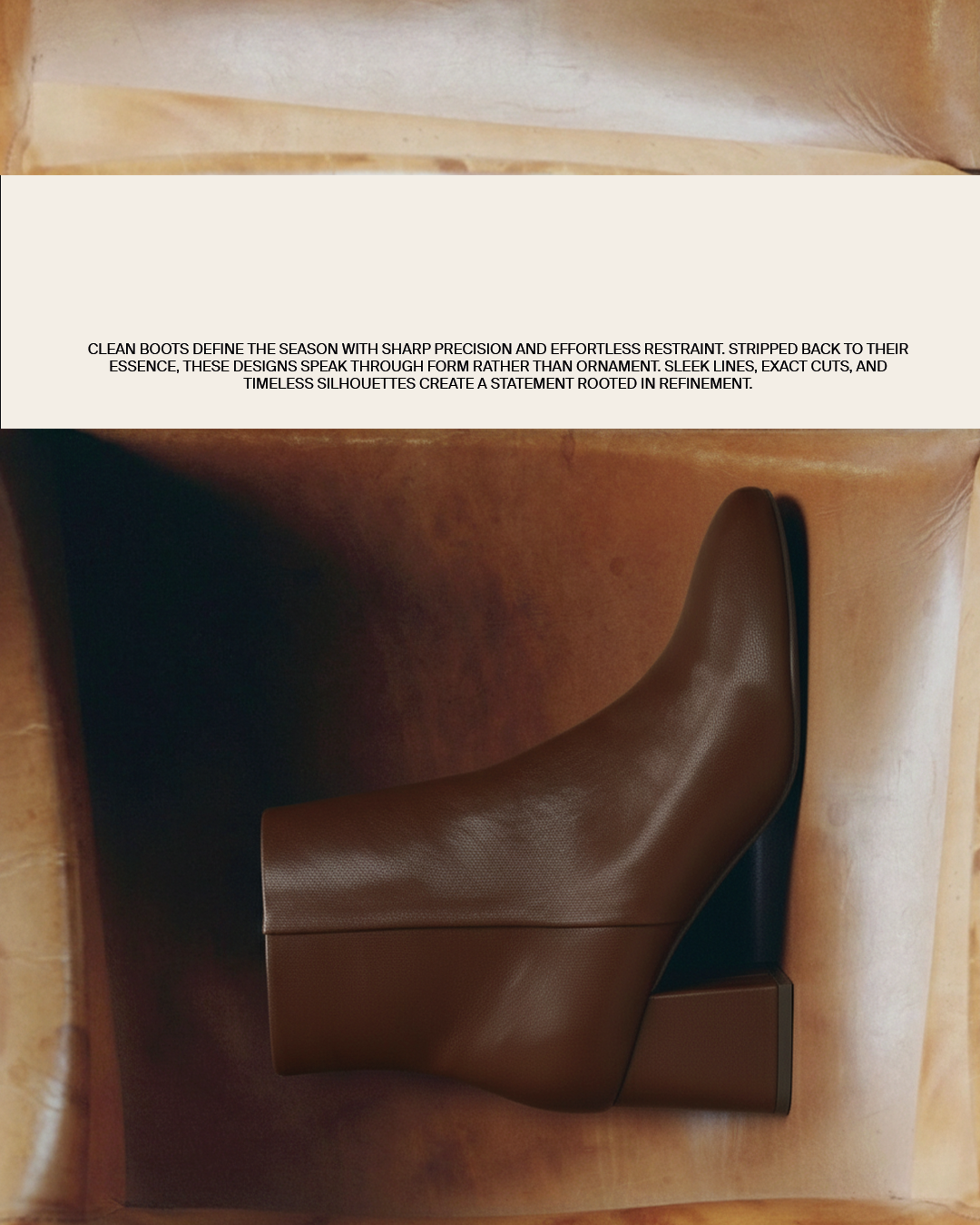 THE CLEAN EDIT. Clean boots define the season with sharp precision and effortless restraint. Defined by clean lines, balanced proportions, and timeless silhouettes, each pair is designed with intention. Crafted from supple suede and smooth leather in rich, grounded tones, these boots prove that true impact lies in simplicity.